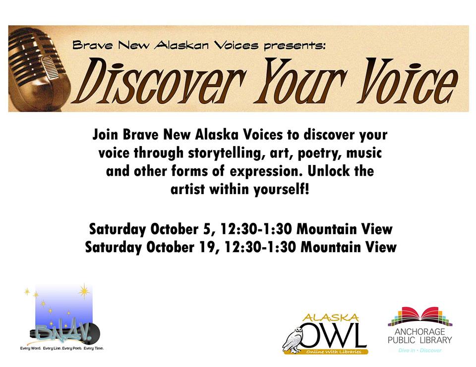 Join Brave New Alaskan Voices to discover your voice through storytelling, art, poetry, music and other forms of expression. Unlock the artist within yourself this Saturday from 12:30-1:30 p.m. at the Mountain View Library.