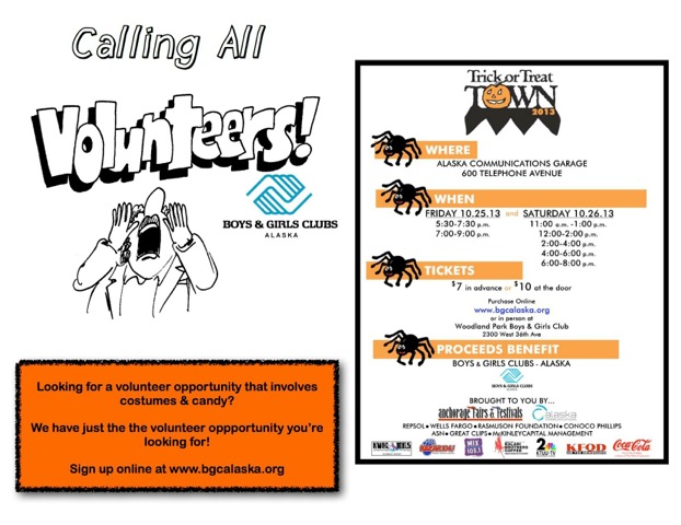 There are still several volunteer openings for Trick or Treat town Friday and Saturday, Oct. 25 & 26 at the Alaska Communications Garage. To sign up for a shift, visit http://bgcalaska.force.com/GW_Volunteers__VolunteersJobListingFS?campaignid=701i0000000FHe9. Please arrive 30 minutes before your shift and make sure your costume is kid-friendly to enhance the fun for the little trick-or-treaters.