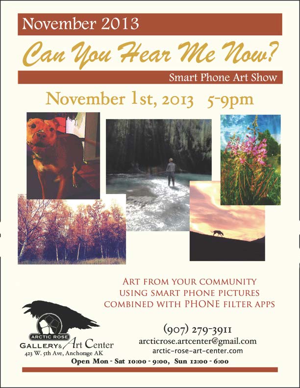 It’s First Friday time! There are so many galleries having opening events it’s impossible to list them all, but this month’s exhibit at Arctic Rose Gallery sounds pretty cool! They will be displaying photos from the Anchorage community that were taken on smart phones. Check out the “Can You Hear Me Now?” art show opening this Friday, Nov. 1, from 5-9 p.m.