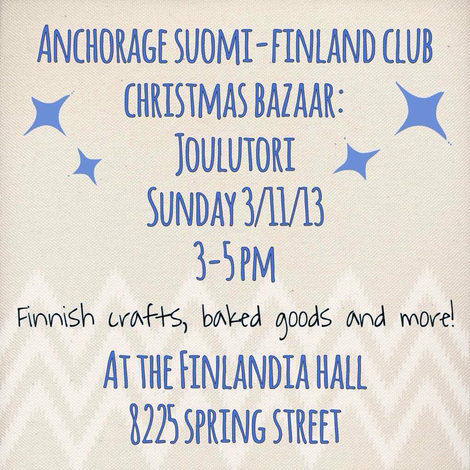Check out Finnish crafts, baked goods and more at the Anchorage Suomi-Finland Club Christmas Bazaar, Sunday, Nov. 3, at Finlandia Hall from 3-5 p.m.