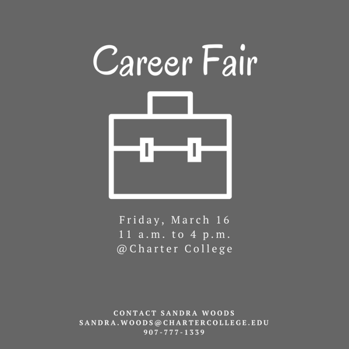 Connect with health care employers from the Anchorage community. Bring your resume, transcripts, and portfolios to share with prospective employers. Charter College will also have program information about the programs offered to help prepare you to enter health care and other supporting fields.