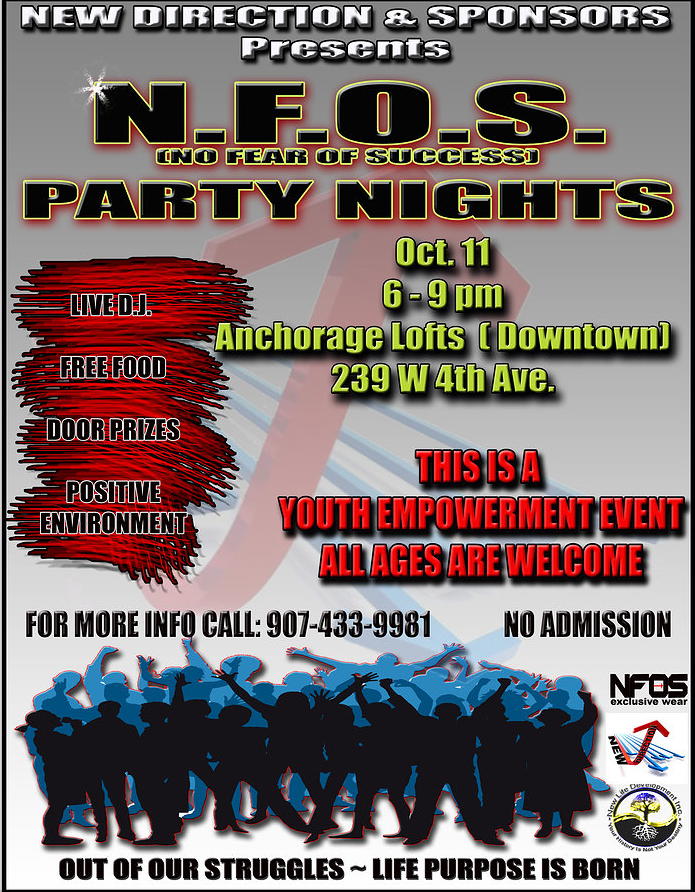 N.F.O.S. Party Night will be an event that you will not want to miss! Head to Anchorage City Limits Friday, Oct. 11 from 6-9 p.m. for a live DJ, free food, door prizes and a positive environment. This event is free and open to the public!